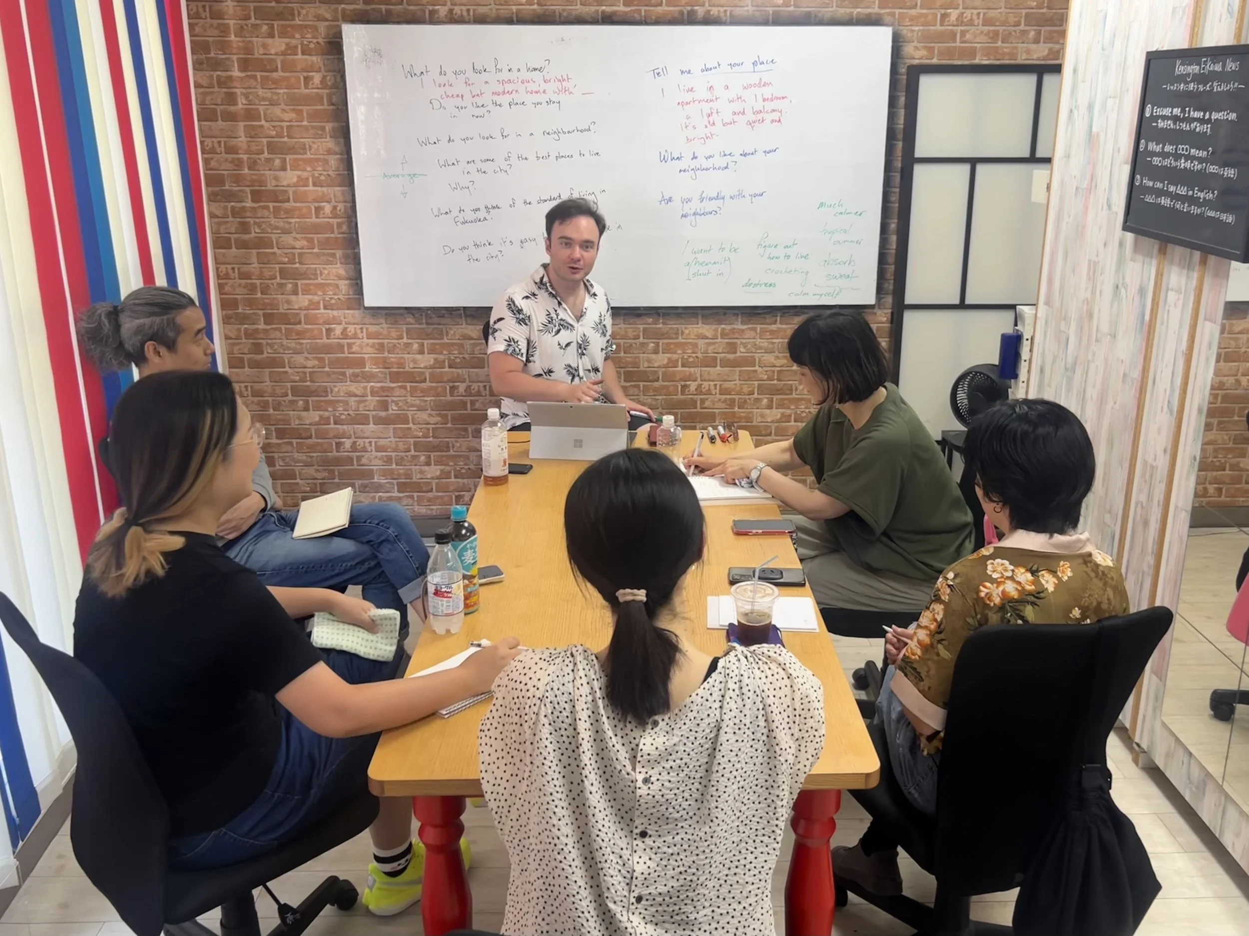 ウインザー英会話にご入会の生徒さんは月四回のレッスンや追加のレッスンを、ウィンザー英会話の姉妹校ケンジントン英会話の教室とオンラインレッスンにて受講できます。薬院(ウィンザー英会話)、赤坂(ケンジントン英会話 赤坂本校)、西新(ケンジントン英会話 西新校)、が受講可能な教室のロケーションです。各教室のスケジュールは、それぞれ異なっており、赤坂の教室では土日もレッスンの受講が可能です。教室の雰囲気やレッスンの質は各教室とも一様に上質を保つようにしています。